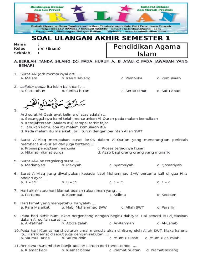 Demikian pembahasan materi kita kali ini mengenai soal pendidikan agama islam (pai) kelas 6. Berilah tanda silang (x) pada huruf a,b,c, atau di depan jawaban yang benar ! Home › bank soal › soal pai › soal uts. Kunci jawaban tema 6 kelas 4 halaman 75. Evalusi pai bab 6 (meniti hidup dengan kemuliaan) halaman 102 pai (pendidikan agama islam) kelas x / 10 sma/smk/mak kurikulum 2013 (k13) b.
